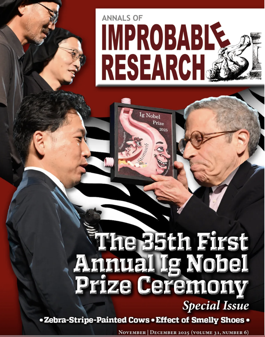 The Journal of Improbable Results from Cambridge, Massachusetts held its 35th Annual Ig Noble Prize awards ceremony this September. Ig Noble Prizes are awarded to actual research studies published in the past year that document improbable or whimsical results in ten different categories. Marc Abrahams, editor of the Journal, opened the 2025 Ig Noble Prize award ceremony with, “Every great discovery ever, at first glance seemed screwy and laughable. The same is true of every worthless discovery. The Ig Noble Prizes celebrate ALL these discoveries, because at the very first glance, who really knows.”
