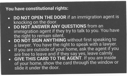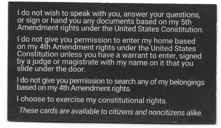 A Cape Cod health center has issued cards of instructions to their patients on how to assert their legal rights in barring agents from their homes . . . IF there is a knock on the door, of course. The card describes the rights and law correctly. It is one reason why we hear about and see so many street abductions.